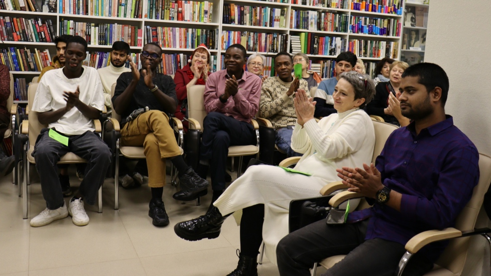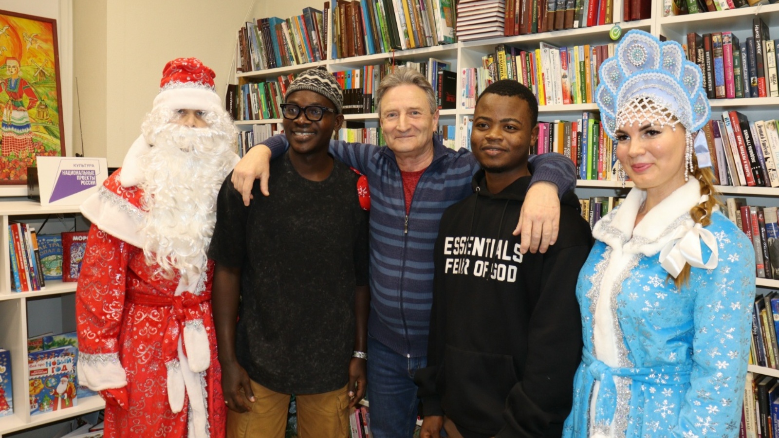 Не заставил себя ждать и Дедушка Мороз в исполнении сотрудника модельной библиотеки Алексея Круцких. Он, как и полагается, принёс «хорошим девочкам и мальчикам» целый мешок подарков. Каждый гость, подготовивший стихотворение или песенку, получал приятный сюрприз от доброго волшебника. Особенно проявили себя студент из Бангладеш, исполнивший на русском языке песню «Ой, мороз, мороз» и читатели модельной библиотеки – Елена Танюшина и Сори Кейта из Республики Гвинея, прочитавшие стихотворения о Новом годе на русском и французском языках.