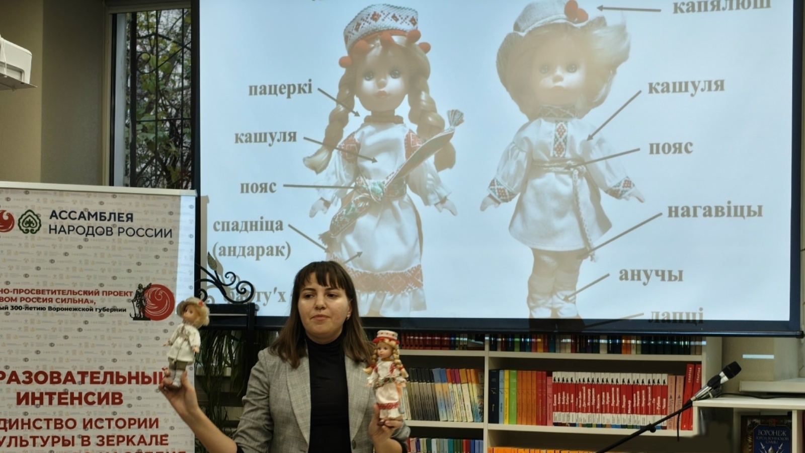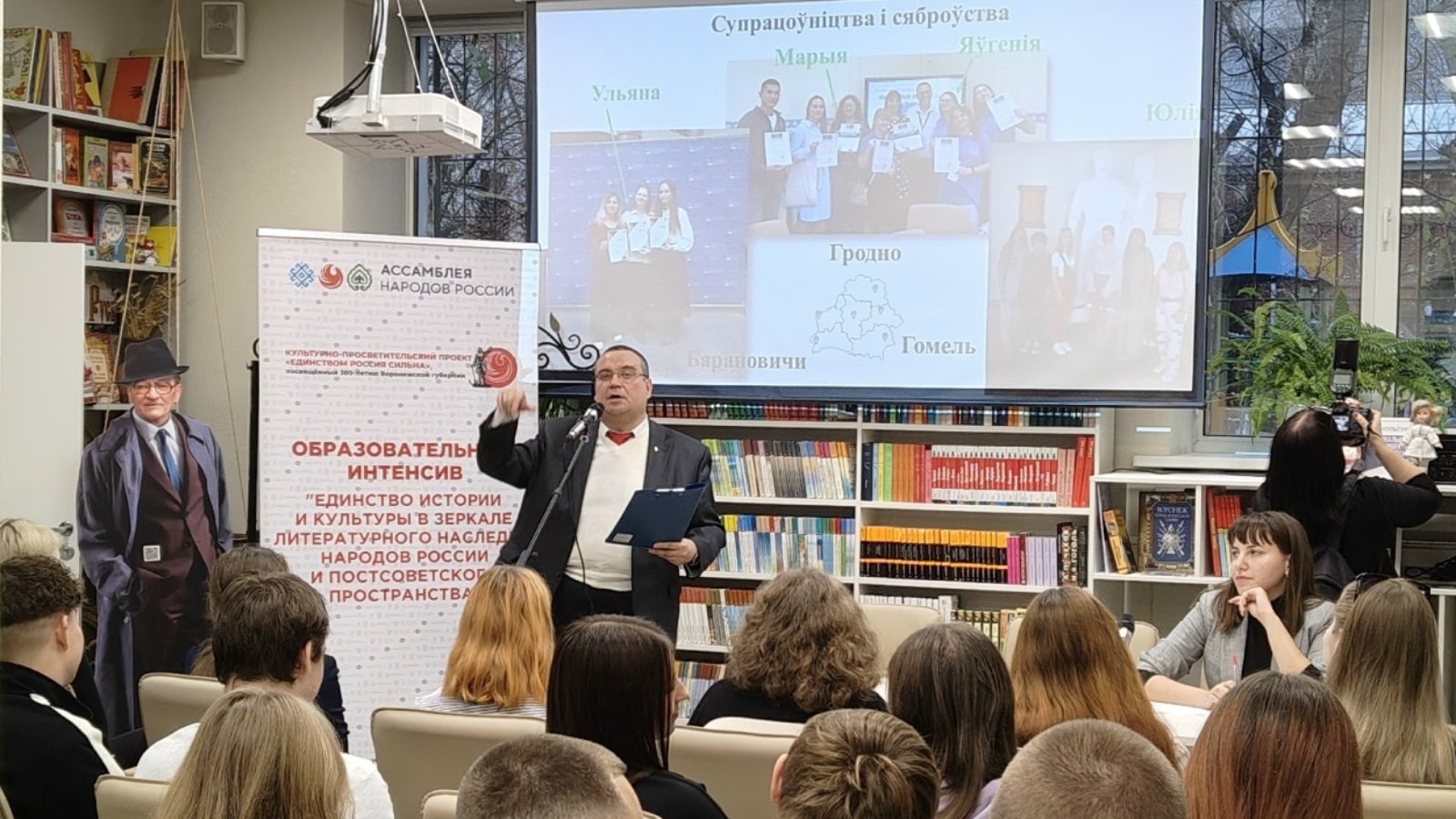 12 ноября в Воронежской модельной библиотеке № 32 имени Г.Н. Троепольского состоялось заключительное мероприятие серии образовательных интенсивов «Единство истории и культуры в зеркале литературного наследия народов России и постсоветского пространства». Почётными гостями встречи стали руководитель Центра славянских языков и культур филологического факультета ВГУ Дарья Гальцова и доцент ВГУ, кандидат филологических наук Владимир Гусаков.