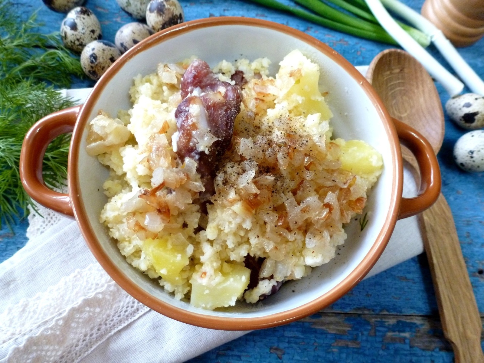 - Рецепт идёт из старины и передаётся в нашей семье из поколения в поколение, вот и моей маме он перешёл от моей бабушки. Одну часть пшена и 3 части воды ставим варить до полуготовности, добавляем сырую картошку (2-3 штуки) и варим до готовности. А в это время солёное сало режем на кубики и вытапливаем, как можно сильнее. Когда каша сварилась, добавляем в неё это сало вместе с топлёным жиром. Мешаем, укутываем, чтобы настоялось. Получается каша - просто объедение!