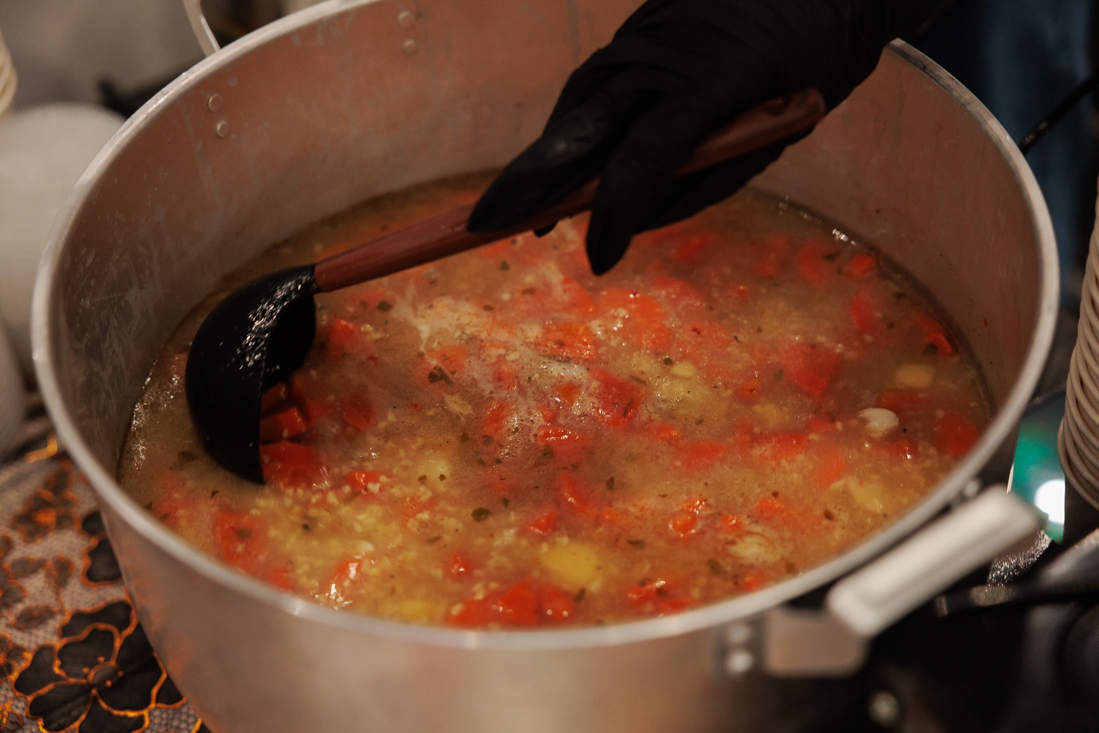 – Это уха из петуха, – рассказывает Валерия Каменская, организатор фуршетов под брендом «Только попробуй», указывая на большую кастрюлю, из которой разносится приятный аромат. – Это просто отдельный вид искусства. Почти сутки варили пять куриных тушек. Сделали просто великолепный прозрачный бульон с лавровым листом, с обжаренным луком и морковью. Потом процедили всё это, добавив туда пшена. Его тоже обварили. Засыпали крупно нарезанные картофель и морковь, а затем и рыбку. Это же уха, вы не забыли? Рыбка тут у нас трёх видов: сом, минтай и треска. Попробуйте, очень вкусно!