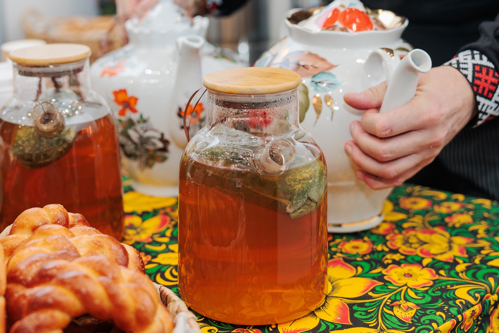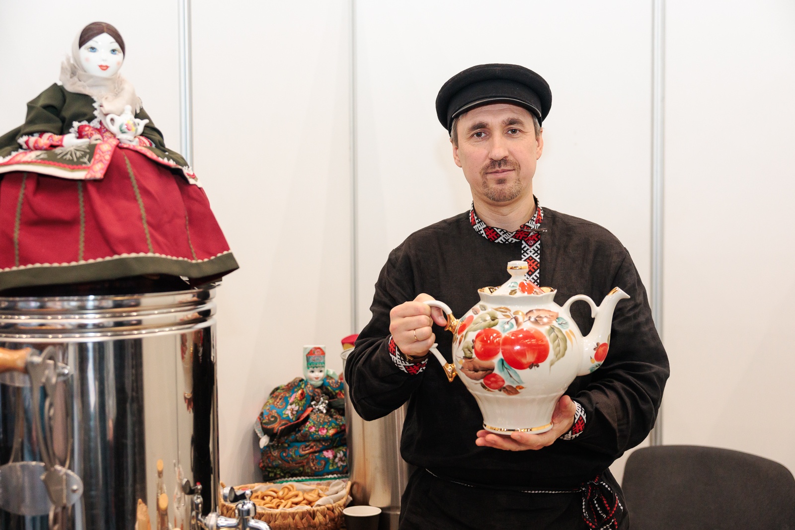Стенд фермера и предпринимателя Алексея Синецкого сразу обратил на себя внимание. Еды у него, кроме связки калачей, почти нет, зато есть много чая. Огромный 40-литровый трактирный самовар на дровах и с куклой-грелкой наверху, чайники, свежезаваренный чай из таволги, мяты, душицы и чабреца в разных вариантах.