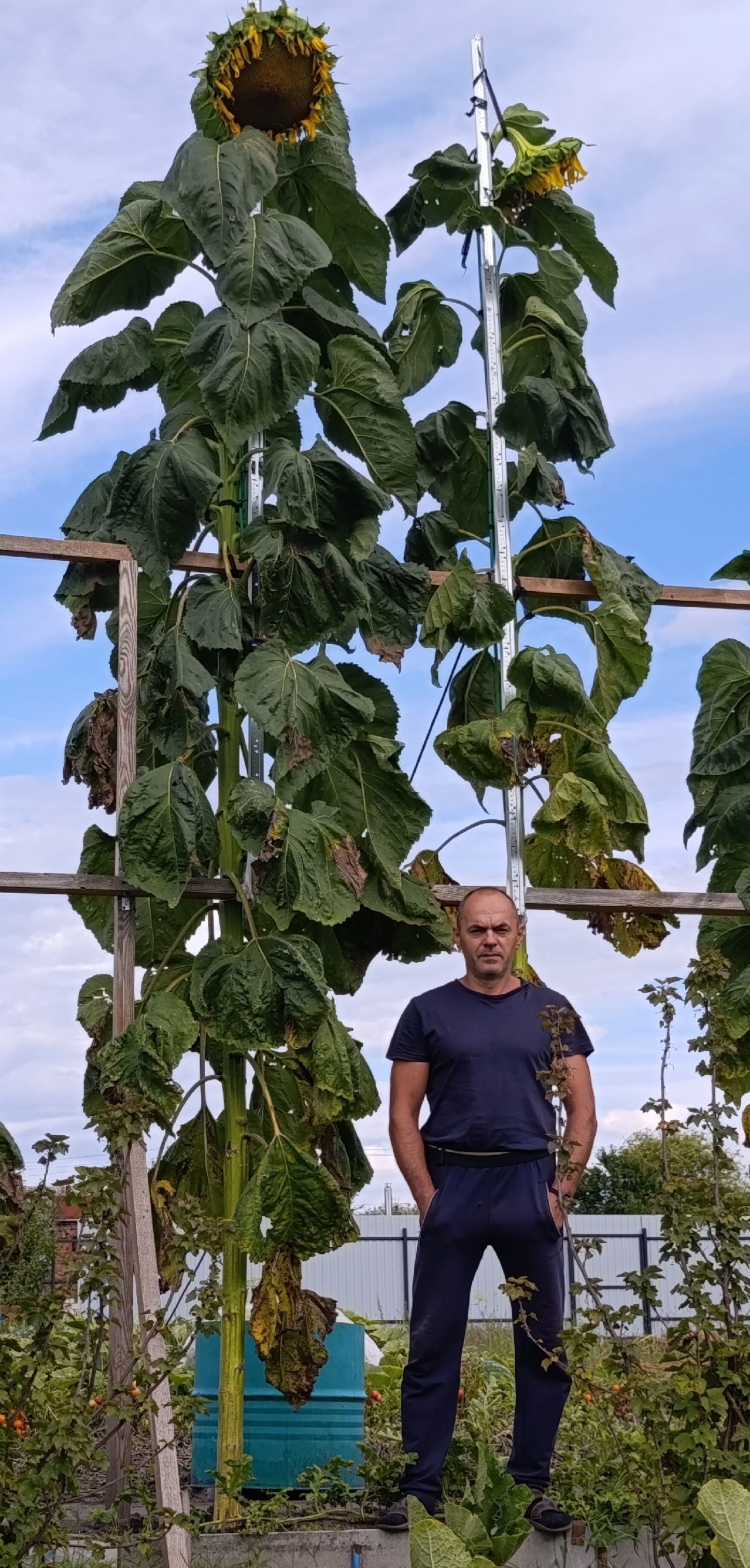Супруги Ташаевы вырастили подсолнечник высотой 4,5 метра. Окружность его соцветия составила 1,5 метра