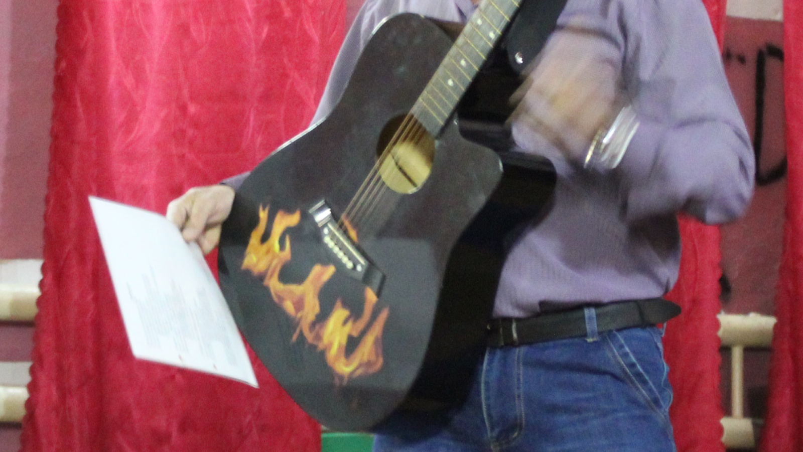 С гитарой мужчина познакомился в годы юности. Услышал как-то игру соседа на улице и заинтересовался инструментом. Когда узнал поближе, что такое гитара – загорелся идеей заполучить такую же и приобрёл её по тем временам за 50 рублей. Кстати, нынешний приметный инструмент с огненными всполохами Роман получил в подарок от своего друга. Освоив игру на гитаре, парень стал выступать на улице, исполнял свои песни наряду с гармонистами-частушечниками.