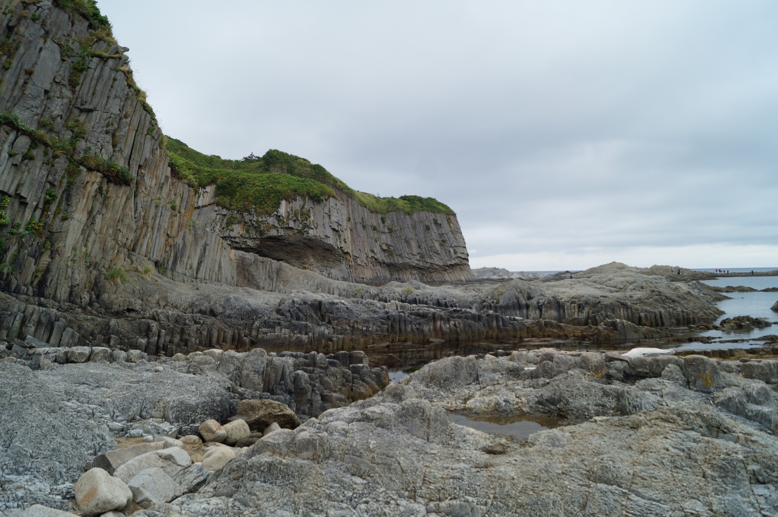 Затем поехали на мыс Столбчатый. Своё название он получил от горы, вертикально сложенной базальтовыми «карандашами». Их высота достигает 40-50 метров. При этом у подножия скалы во время отлива можно увидеть своеобразную «мостовую» из верхушек базальтовых столбов, отполированных морем до зеркального блеска. На выступах мыса такие столбы напоминают тротуарную брусчатку. Наверху растут карликовые дубы, бамбучник, шикша и другие растения. Место идеально подходит для фотосессии. Внизу у мыса есть возможность искупаться в море.