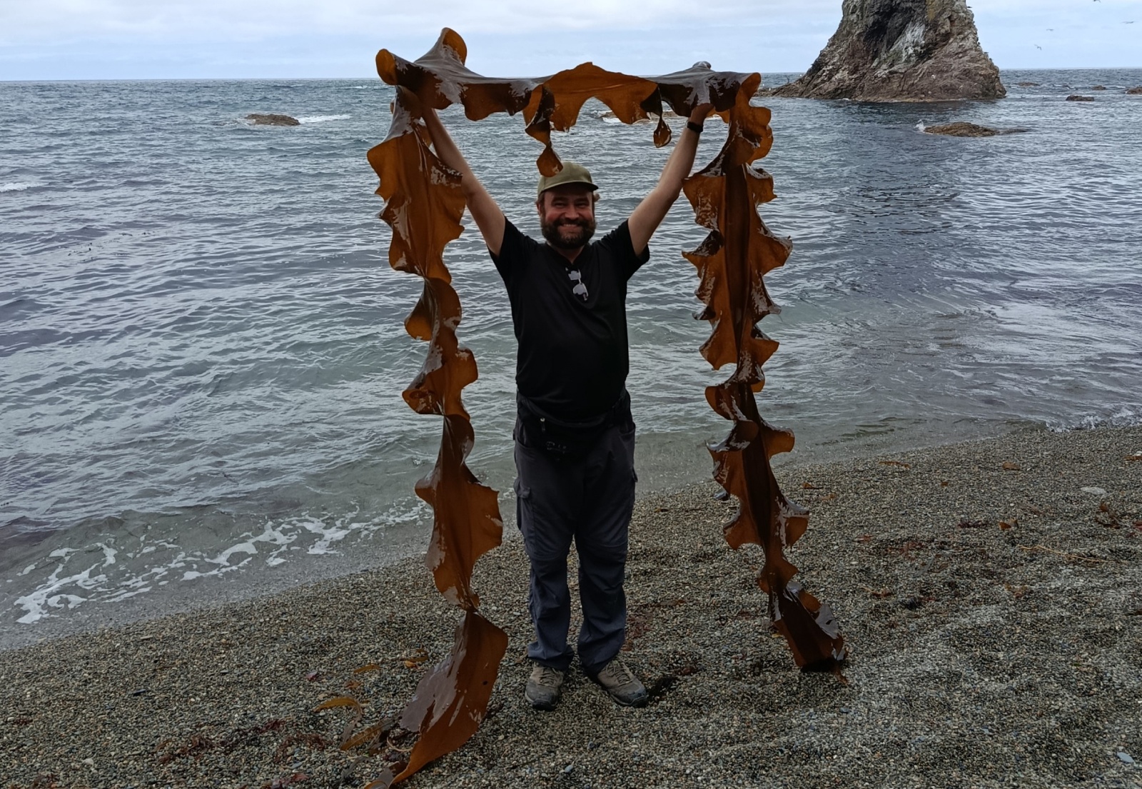 В бухте Тихая на берегу увидели много выброшенной из моря ламинарии или морской капусты, которую у нас многие знают по салатам. На самом деле растение это просто огромное! От него нас отвлекло завораживающее зрелище. Возле стоянки автобуса небольшая речка впадала в море. В это время в её русло на нерест начала заходить горбуша. Было интересно наблюдать за этим процессом, особенно за всплесками воды от движения рыбы.