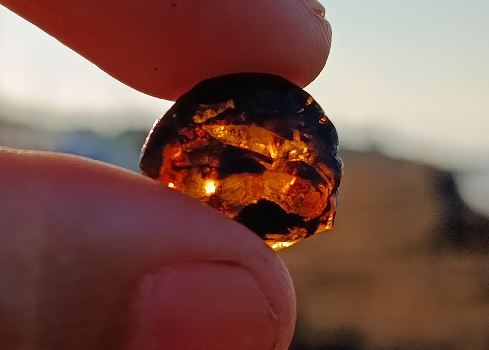 Прежде чем приехать на конечную точку, предстояло посетить ещё пару интересных мест. Первое из них — это Янтарный пляж в посёлке Стародубском. Оказывается, не только в Калининградской области добывают янтарь. На Сахалине хоть и нет его промышленной добычи, после шторма на берегу можно найти небольшие камешки янтаря, поисками которых мы тут же и занялись. Кроме янтаря волны также выбрасывают небольшие куски каменного угля, отчего берег приобретает чёрный оттенок. В море периодически показывались нерпы и плавали любопытные чайки. Жаль, что на поиски янтаря дали всего 20 минут. Это довольно увлекательное занятие!