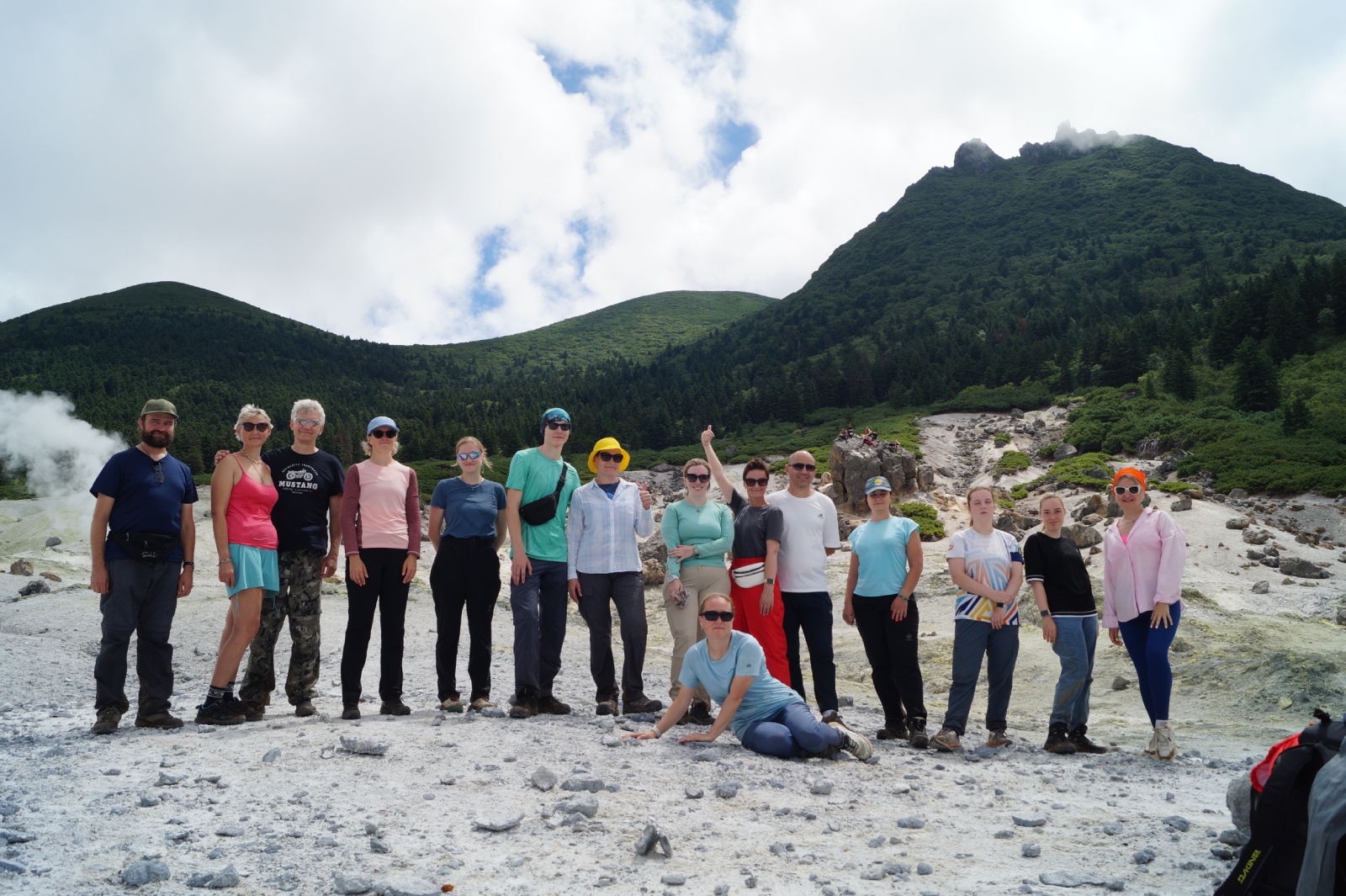 Следующим этапом стало путешествие к фумаролам вулкана Менделеева. Через трещины там выходили горячие газы и пар, образующиеся там, где магма нагревает подземные воды. Сам вулкан Менделеева относится к особо охраняемой природной территории, а в 1983 году он получил ещё и статус памятника природы. Серые и жёлтые горные породы создают впечатление лунного пейзажа. Отсюда открываются виды на горы Хоккайдо, расположенные за Кунаширским проливом. Периодически освобождаясь от грузных облаков, открывалась вершина вулкана.
