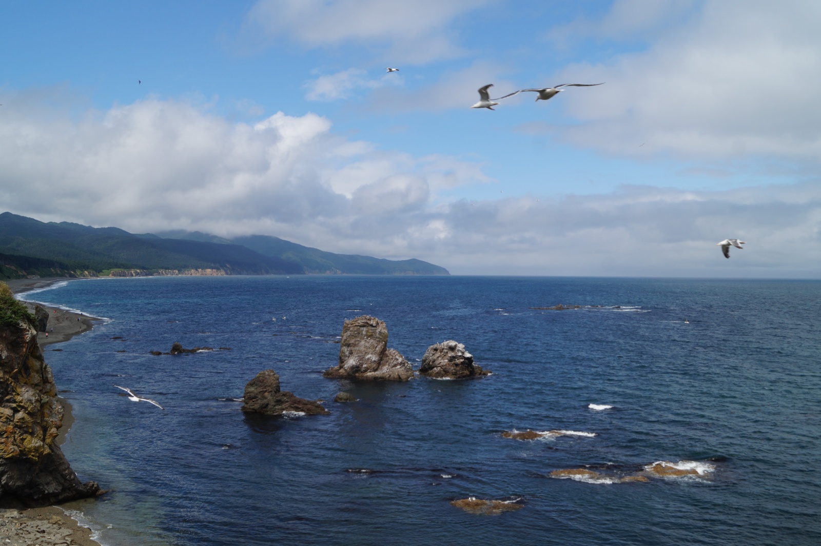 Поднялись на скалу, чтобы оттуда рассмотреть мыс и море. Дорога на вершину проходила по лесу. Сначала увидели созревающие ягоды клоповки, затем прошли через поросли молоденьких пихт, папоротника, бамбучника и майника. Далее тропа тянулась по краю обрыва, с которого открывались великолепные виды на море, мыс Птичий и останцы с птичьими базарами. Чайки кружили так близко, что в любой момент могли бы сесть на вытянутую руку, если бы в ладони лежал кусочек хлеба.
