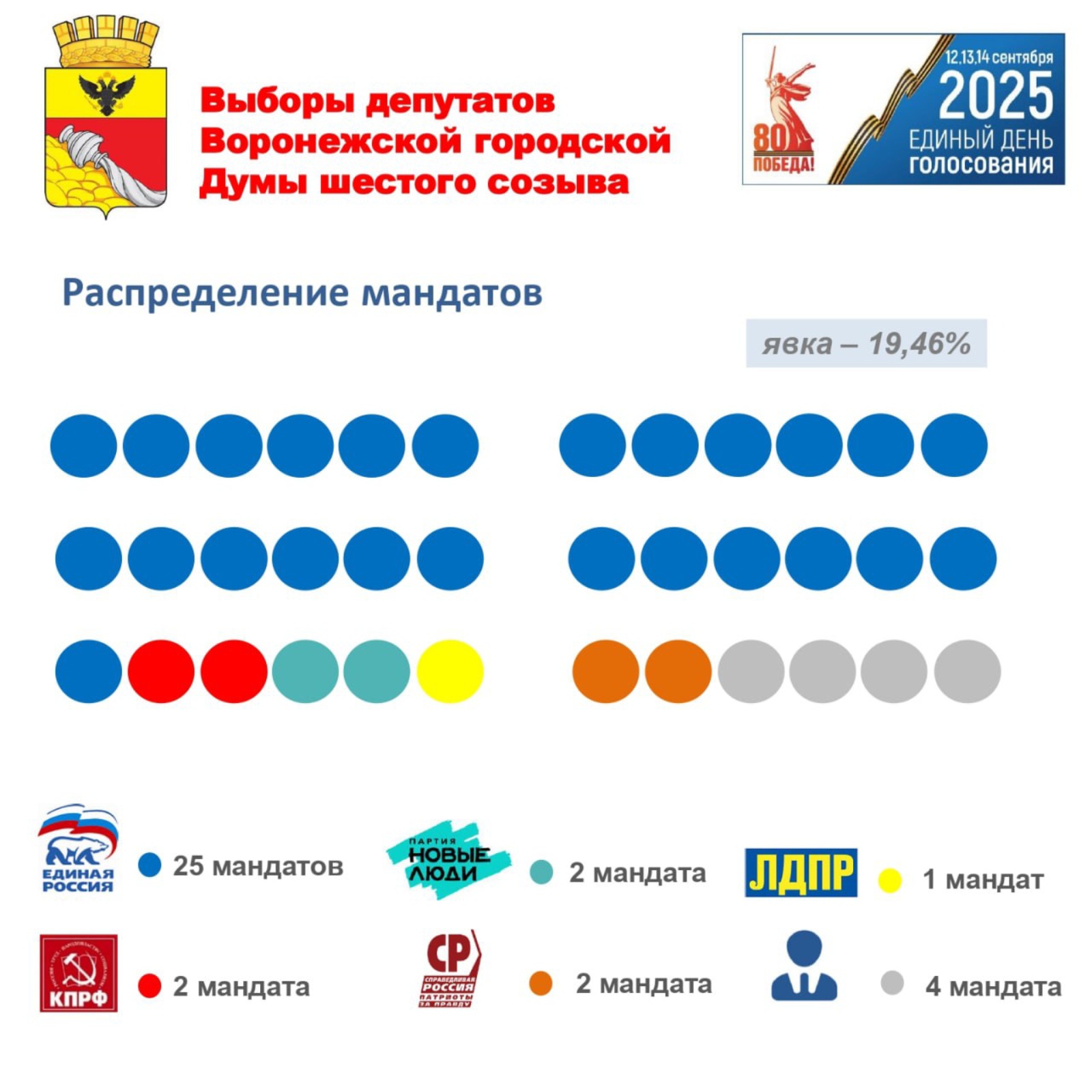 По итогам голосования на выборах в органы местного самоуправления Воронежской области мандаты получили кандидаты от шести партий и самовыдвиженцы: