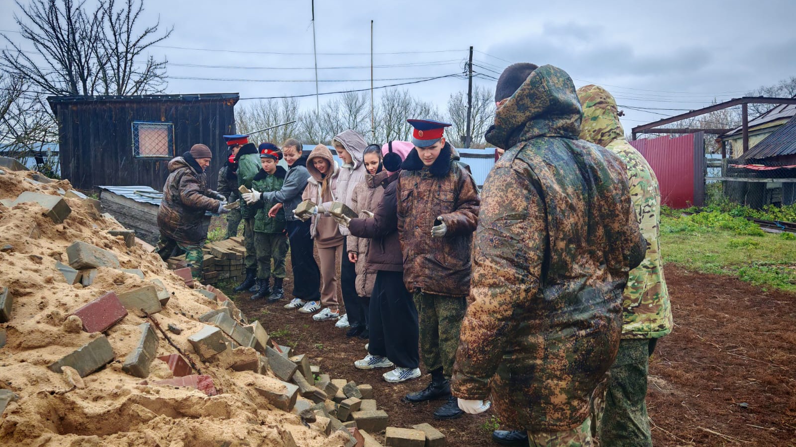 Как правило, в Борщево дети приезжают не только в качестве экскурсантов, но и помощников - чистят речку или колодец, ремонтируют мостик. Вот и сейчас, несмотря на непогоду, кадеты предложили свою помощь на стройплощадке. Выстроившись цепочкой, ребята ровно уложили разбросанную плитку.
