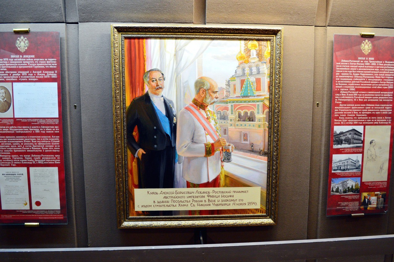 В экспозиции представлены уникальные архивные документы МИД РФ и предметы из фонда музея. Центральным экспонатом стала картина художницы Марины Варенцовой-Русевой, на которой изображена встреча князя и императора Австро-Венгрии Франца Иосифа. Оригинал полотна был передан в дар российскому посольству в Вене непрямым потомком дипломата Никитой Лобановым-Ростовским. Также на выставке представлено множество важных документов, а также список наград министра и копии некоторых из них.
