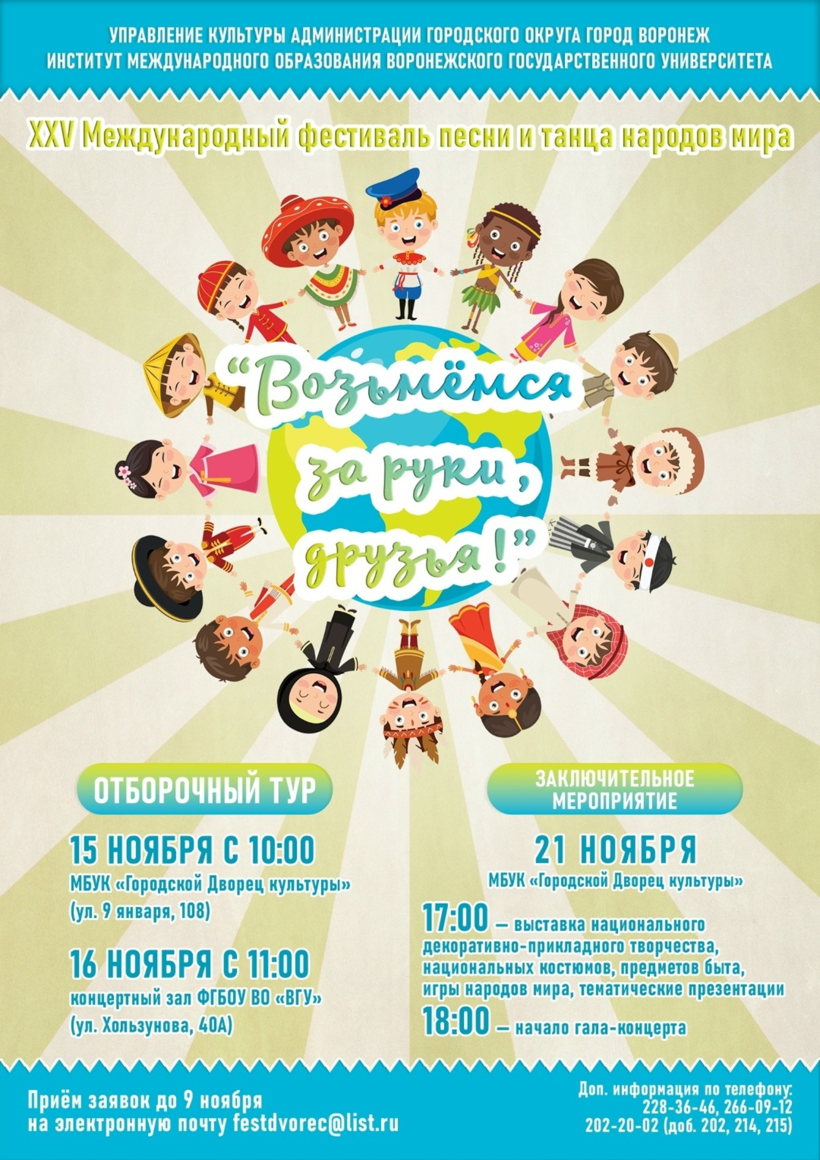 Международный фестиваль песни и танца народов мира «Возьмёмся за руки, друзья!» с 2001 года стал настоящим мостом дружбы и творчества, объединяющим студентов, творческие коллективы и всех, кто любит и ценит культуру разных народов. В этом году фестиваль приурочен к Международному дню студента и пройдёт под девизом: «За международное согласие, против расизма и насилия». Его организаторами являются управление культуры администрации города Воронежа и Институт международного образования Воронежского государственного университета.