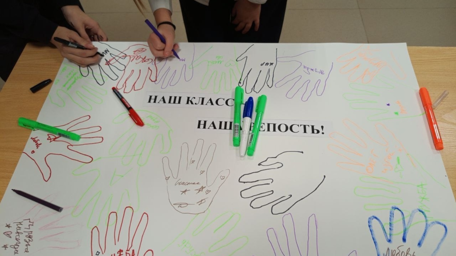 Затем ребята нарисовали плакат «Наш класс — наша крепость», оставив на нём изображение своих ладошек и пожелания для одноклассников, сформировав атмосферный и тёплый призыв к дружбе и взаимоуважению.